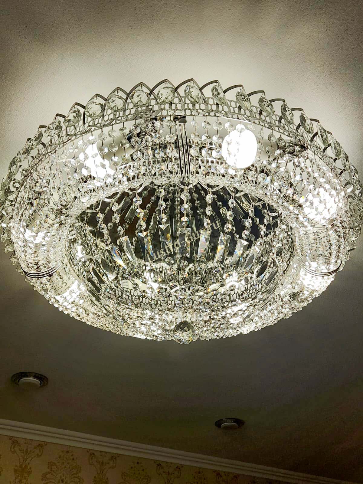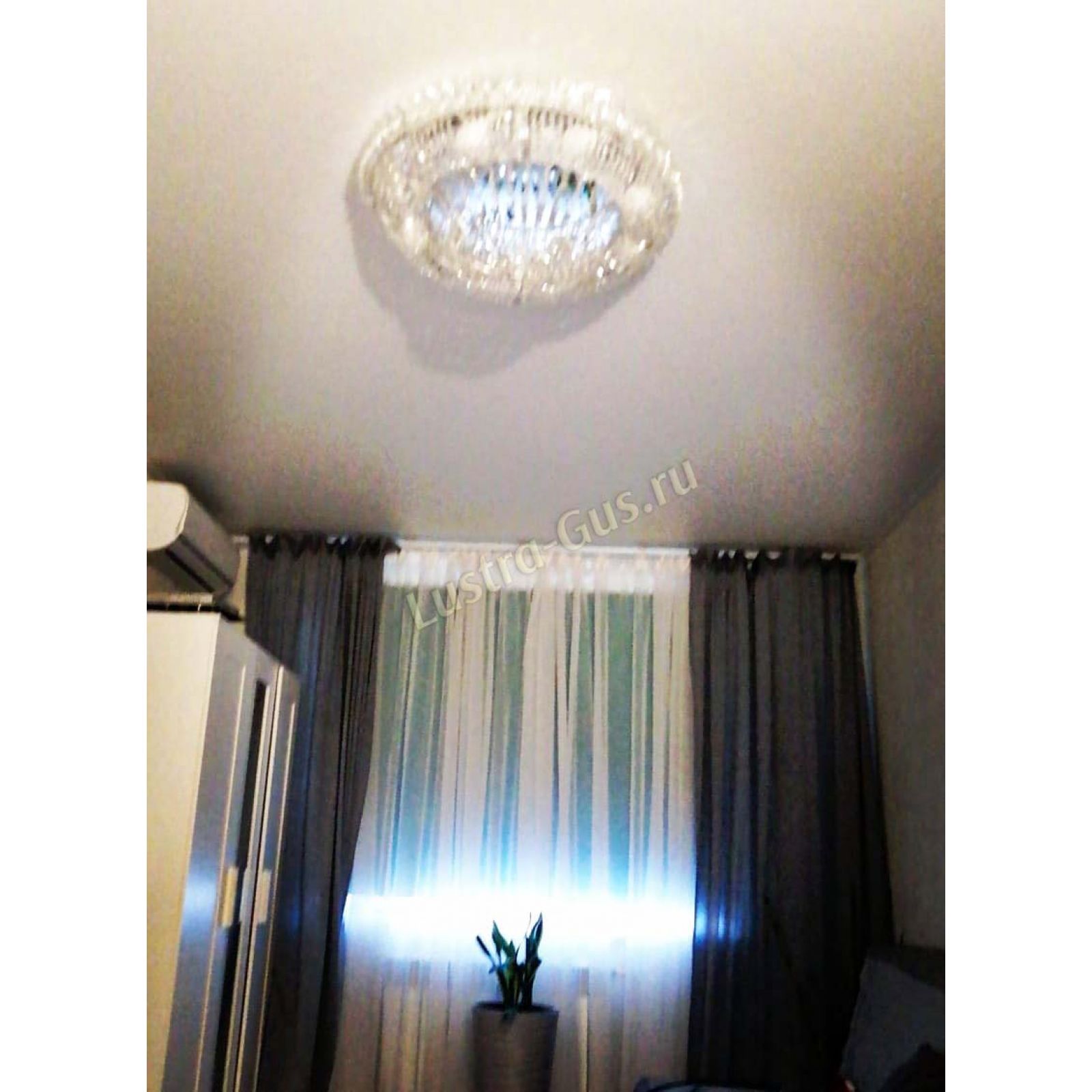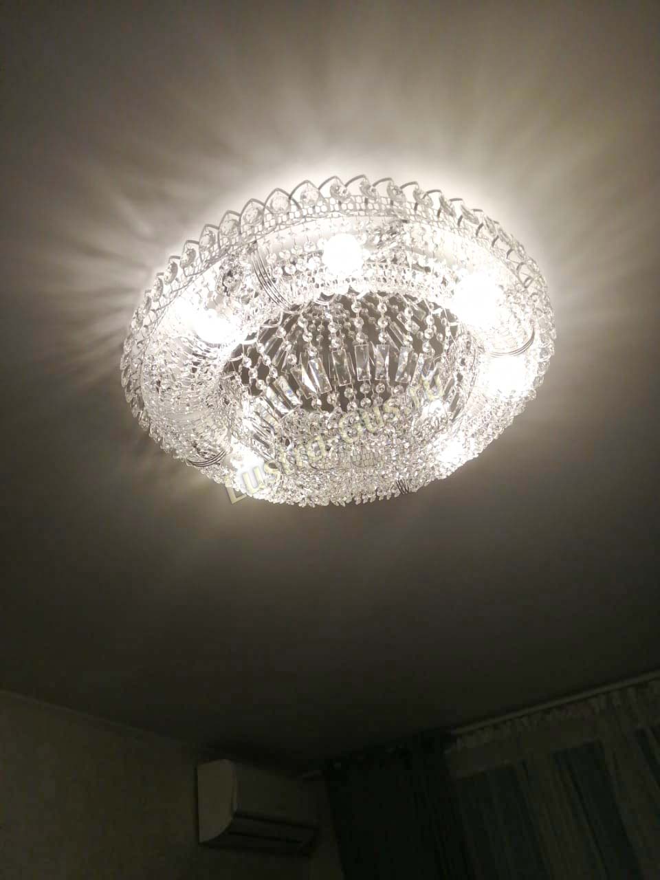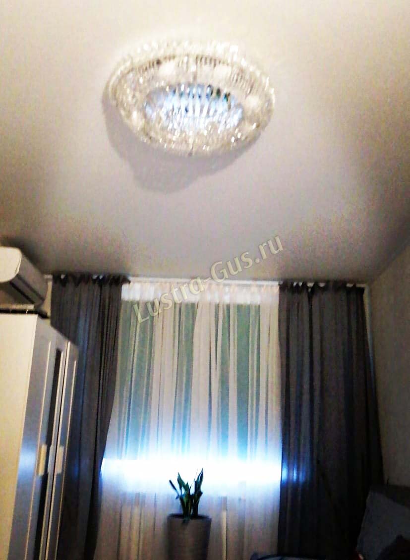 Добрый день! Купили потолочную люстру в мае. Очень довольны, доставка отличная, очень хорошо упакована, красивая и воздушная, размер 70см, в комнате 18кв отлично смотрится. ГУСЬ ХРУСТАЛЬ, СПАСИБО!!