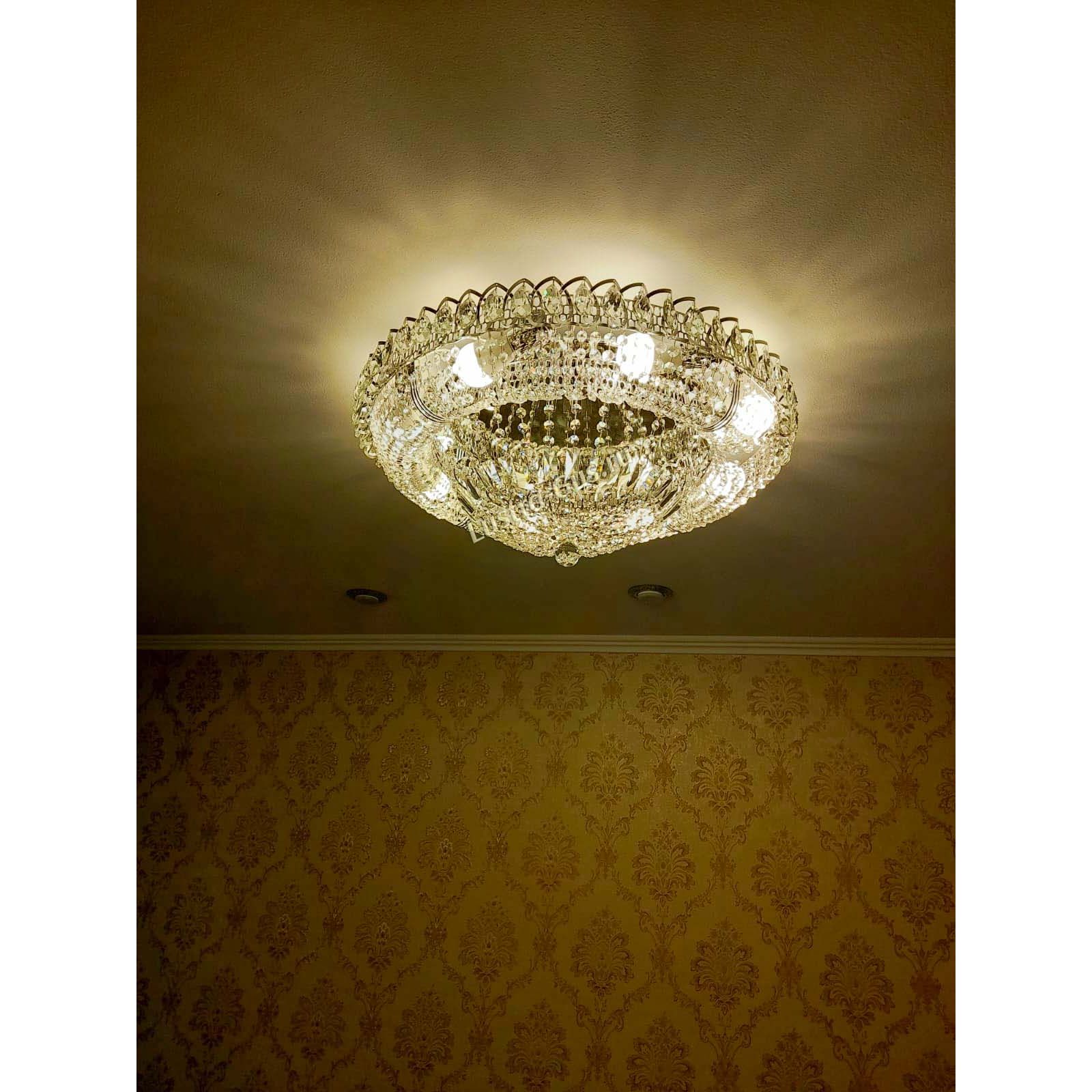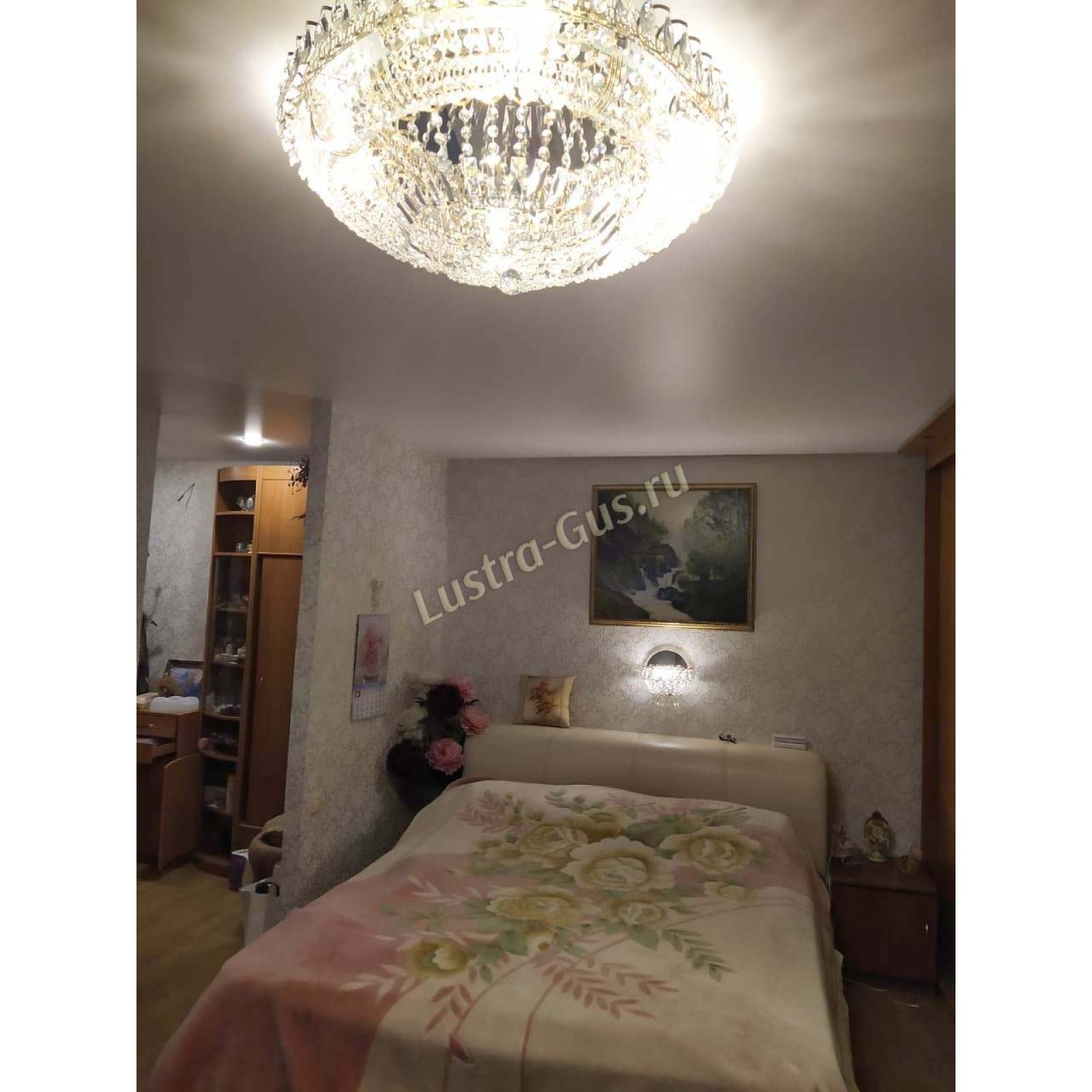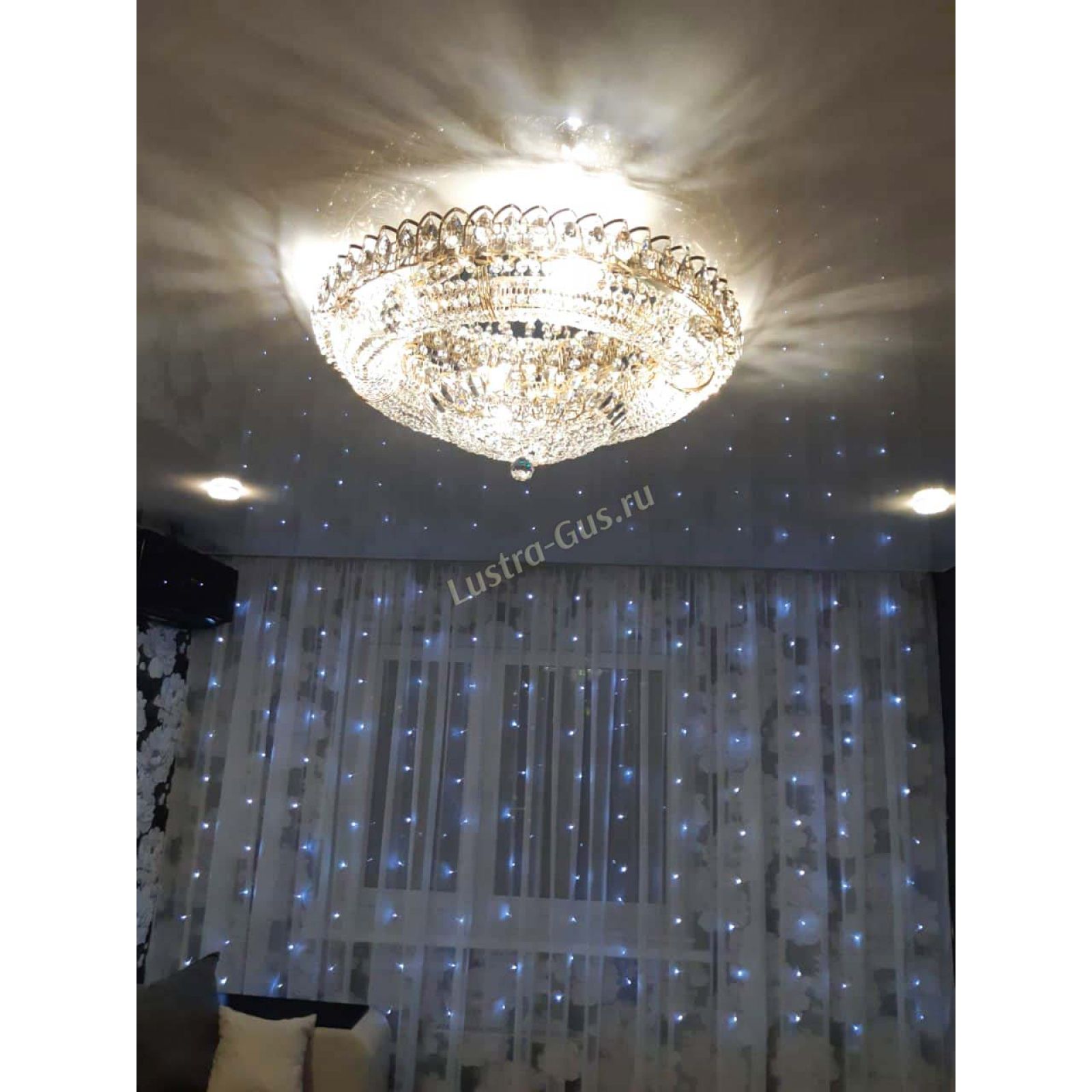 Добрый день! Купили потолочную люстру в мае. Очень довольны, доставка отличная, очень хорошо упакована, красивая и воздушная, размер 70см, в комнате 18кв отлично смотрится. ГУСЬ ХРУСТАЛЬ, СПАСИБО!!